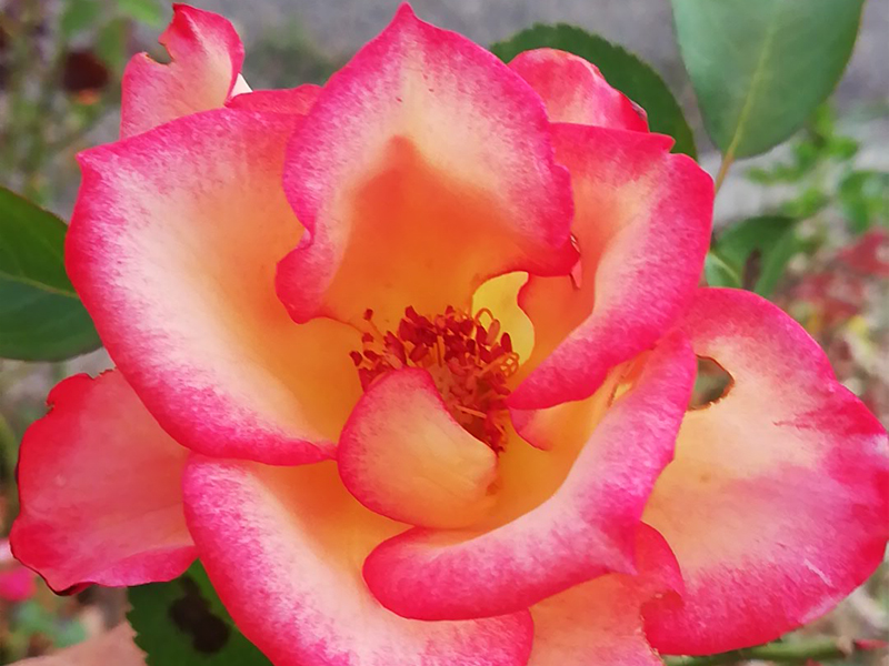 Die einfachen Blüten öffnen aus magentaroten, kugeligen Knospen und zeigen leuchtend gelbe Blütenblätter mit rotem Rand. Sie erscheinen in Büscheln und zeigen charmant die Staubgefäße. Beim Abblühen verblasst die Farbe Gelb und wird Weiß. Der Wuchs ist kompakt und erreicht eine Höhe von 120 cm. Als Einsteigerrose und Bienenweide geeignet - auch als Bodendecker und Höhere Beetrose, weil sie sehr breitbuschig wächst.